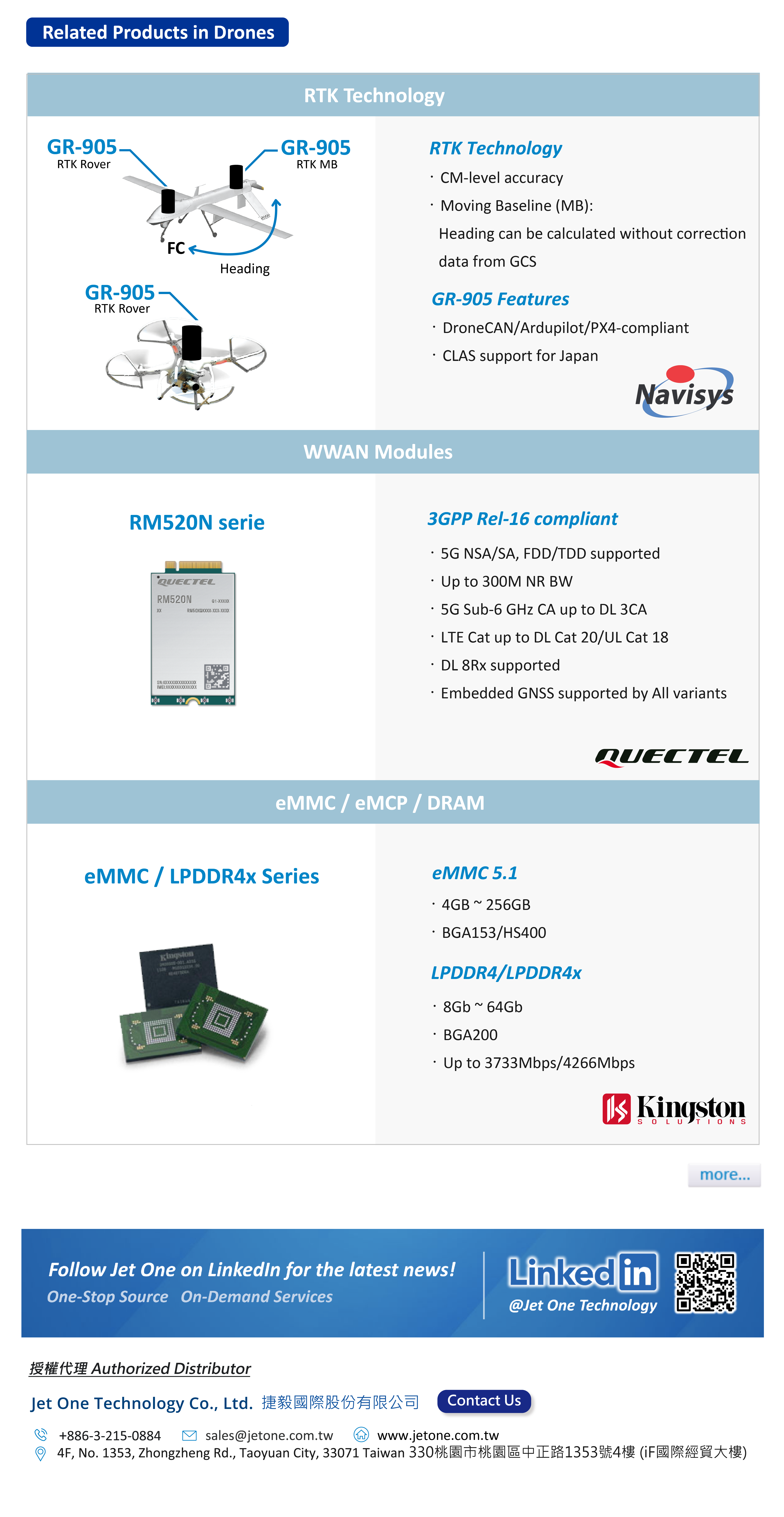 Drones (Unmanned Aerial Vehicles, UAVs) have seen their applications widely expand from the military to commercial sectors, bringing about tremendous convenience and innovation. With the accelerated development of advanced technologies like AI, 5G, and Edge Computing, Jet One provides professional drone solutions, including key components such as GPS Modules, WWAN Modules, and eMMC, to meet the future demands for continuously improving drone capabilities in autonomy, endurance, and precision.